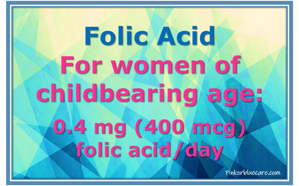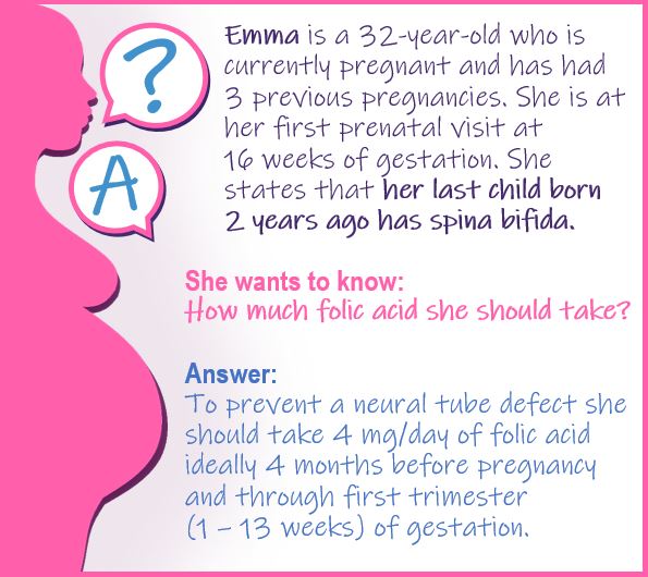 Higher dose is needed: 4 mg folic acid/day starting 1 month before trying to become pregnant (prior to conception) and during the first 6 to 8 weeks of pregnancy.