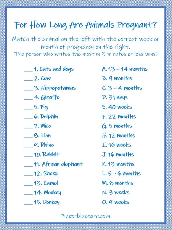 For How Long Are Animals Pregnant โฆ In this game the participants will have to guess how many weeks or months animals are pregnant. The first to finish in 3 minutes or less will win! Enjoy