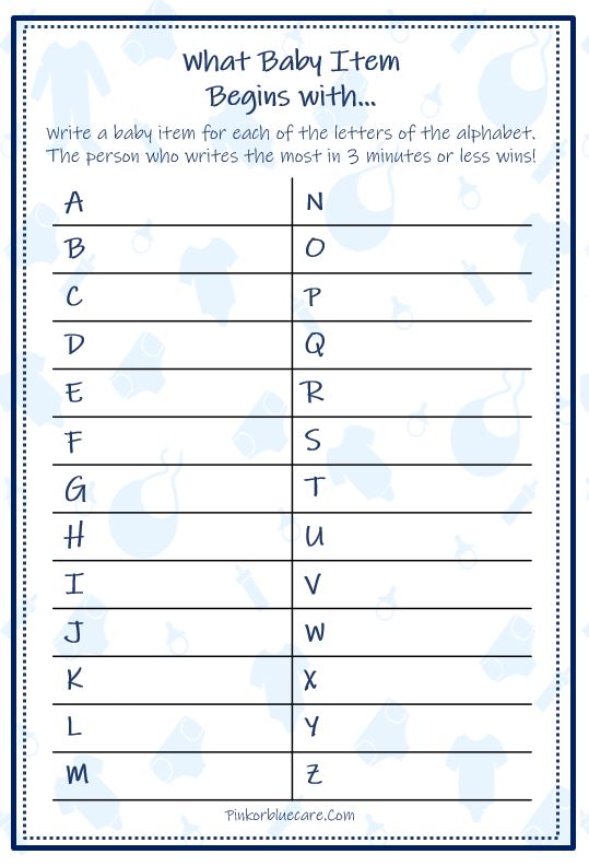What Baby Item Begins Withโฆ In this game the participants will have to write down a baby item with each word of the alphabet. The first to finish in 3 minutes or less will win! Enjoy