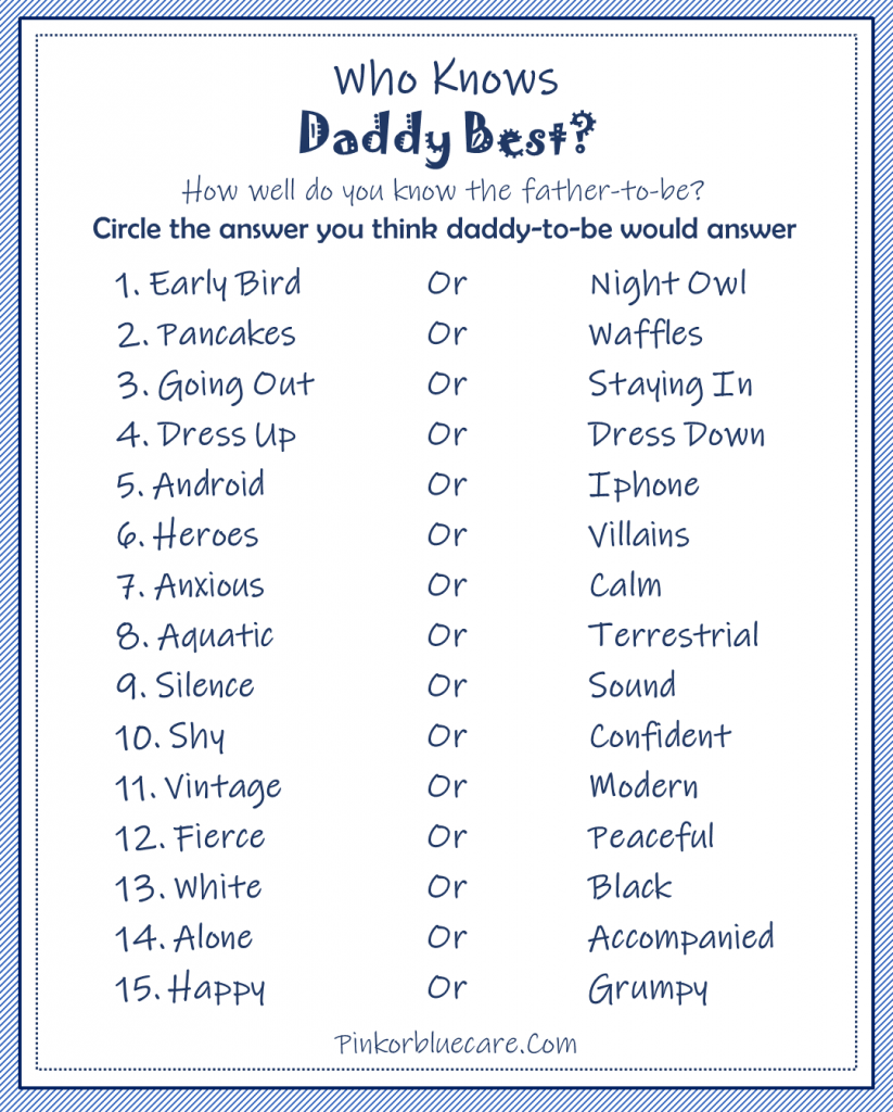 This is a very fun game for baby showers. How well do you know the mommy-to-be or the daddy-to-be. Have fun!