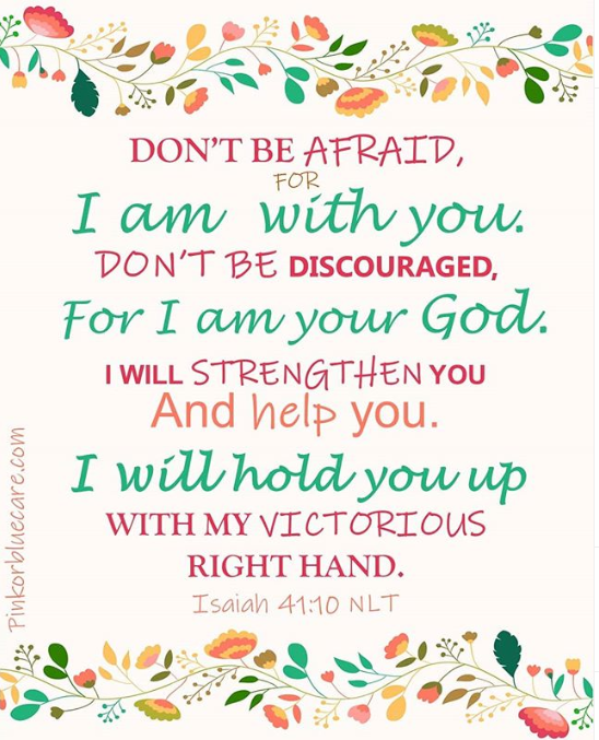 Don’t be afraid, for I am with you. Don’t be discouraged, for I am your God. I will strengthen you and help you. I will hold you up with my victorious right hand.