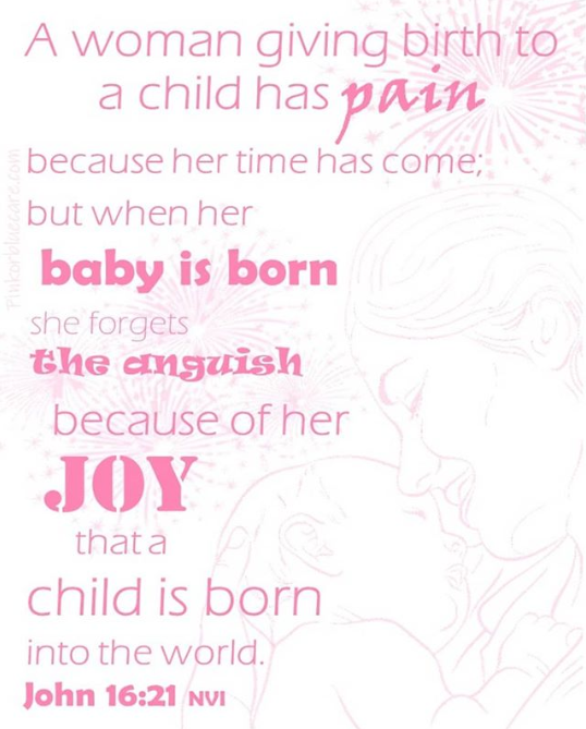 A woman giving birth to a child has pain because her time has come; but when her baby is born she forget the anguish because of her joy that a child is born into the world.